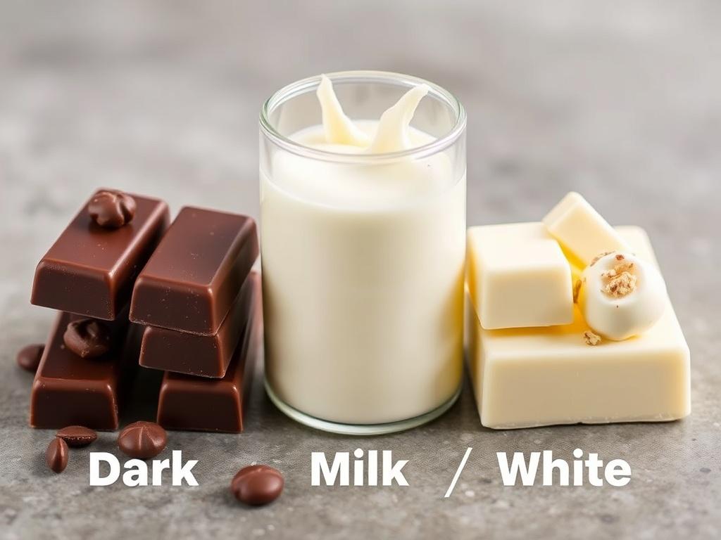 - Белый шоколад: состоит в основном из какао-масла, сахара и молочных ингредиентов; какао-тёртая масса отсутствует. Польза от антиоксидантов минимальна, калорийность часто выше, сахар значителен.